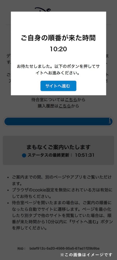 A.待合室で待機中の場合は、自動で次のページへ移動します。他のページやアプリなどを見ている場合は、順番が来たら待合室にポップアップが表示され「サイトへ進む」ボタンを押すと次のページへ進めます。順番が来た時間から10分以内に「サイトへ進む」ボタンを押してください。